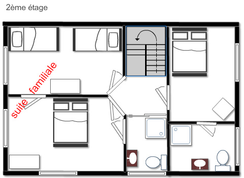 The 2 bedrooms are located on the 2nd floor. We can sleep a total of 6/7 people. The accommodation comprises of a family suite and a double room. The photo above shows the suite which is made up of 1 double room,1 twin and a shower room. This room will sleep up to 5 people plus a cot. The second double room also has an ensuite shower room.